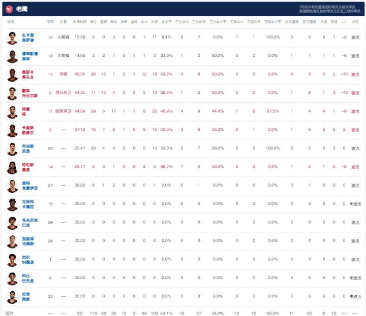 亚特兰大老鹰特雷-杨29分5板11助1断1帽,奥孔古28分12板1助3断1帽,尼昂20分4板4助2断;