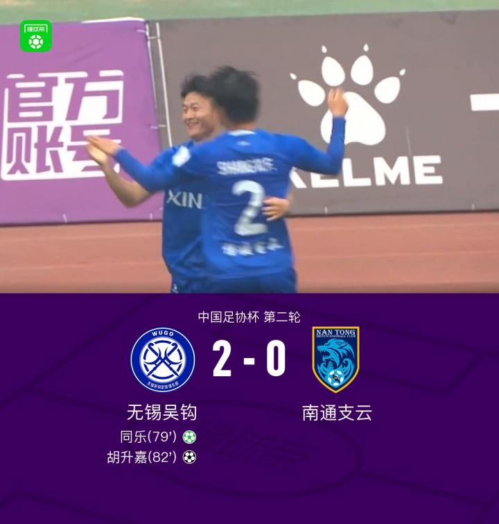 中国足协杯第二轮,无锡吴钩与南通支云展开较量。比赛中,无锡吴钩通过点球机会由同乐完成破门,随后胡升嘉再入一球扩大优势。最终,无锡吴钩以2-0战胜南通支云。