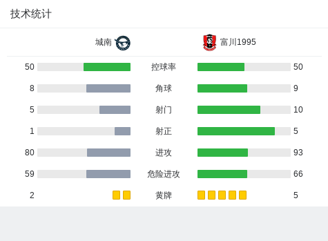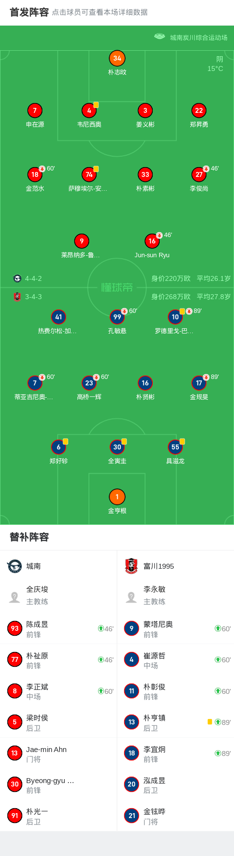 城南FC0-0富川1995,双方互交白卷战报bot @懂球帝2025-04-19 17:21城南FC与富川1995在韩国挑战K联赛第8轮中展开较量,双方在比赛中均未能取得进球,最终以0-0的比分握手言和。点击查看本场比赛详细数据>>点击查看韩K2联完整积分榜>> 球队阵容 技术统计 展开更多