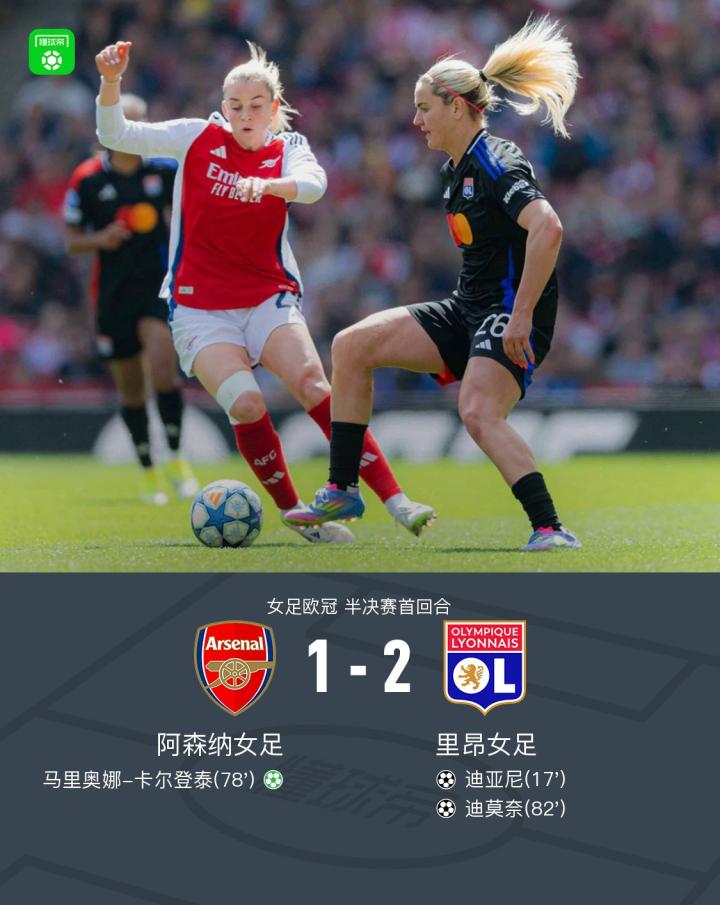 女足欧冠半决赛首回合,阿森纳女足对阵里昂女足。比赛中,里昂女足球员迪亚尼率先取得进球,为球队建立领先优势。随后,阿森纳女足依靠马里奥娜-卡尔登泰的点球破门扳平比分。之后,里昂女足由迪莫奈再入一球,最终将比分定格在2比1。