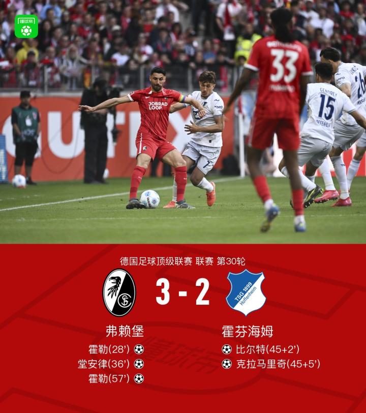 北京时间4月19日,德国足球顶级联赛第30轮,弗赖堡主场迎战霍芬海姆。比赛开始后,弗赖堡迅速占据主动,霍勒首开记录为球队取得领先,随后堂安律再下一城扩大优势。霍芬海姆在上半场补时阶段发起反击,比尔特和克拉马里奇接连进球,将比分扳平。进入下半场,霍勒再度建功完成梅开二度,帮助弗赖堡重新取得领先。最终,弗赖堡以3-2战胜霍芬海姆。