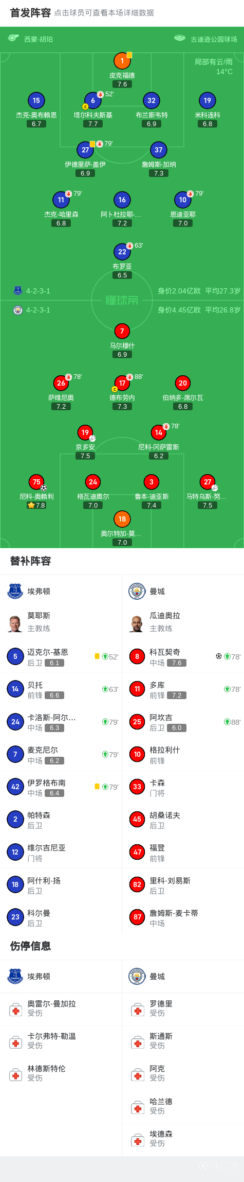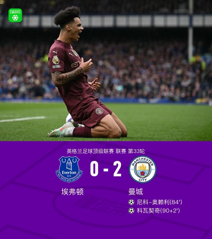 英格兰足球顶级联赛第33轮,埃弗顿主场迎战曼城。比赛尾声,努内斯助攻尼科-奥赖利取得进球,随后京多安助攻科瓦契奇再下一城锁定胜局。最终,曼城客场2-0战胜埃弗顿。