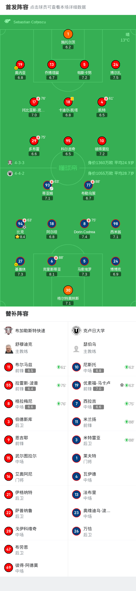 北京时间4月20日,罗马尼亚足球甲级联赛争冠组第5轮,布加勒斯特快速主场迎战克卢日大学。比赛中,克卢日大学由比克率先建功,随后优素福-马卡卢再下一城,帮助球队锁定胜局。最终,布加勒斯特快速主场0-2不敌克卢日大学。