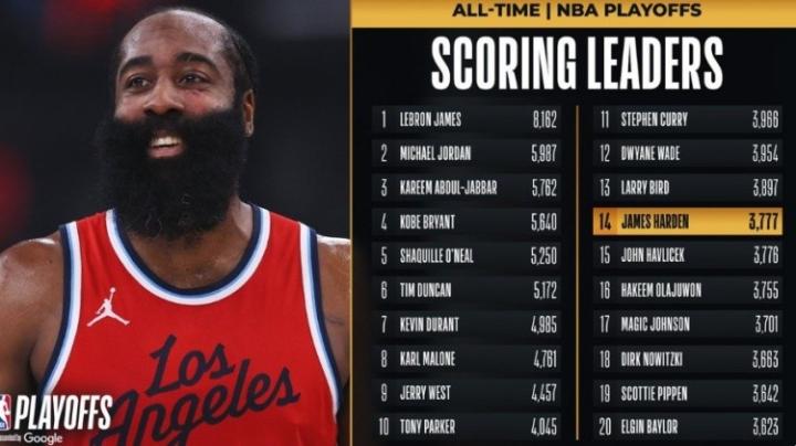 连迎里程碑,哈登季后赛得分升至历史第14,助攻升至历史第8
