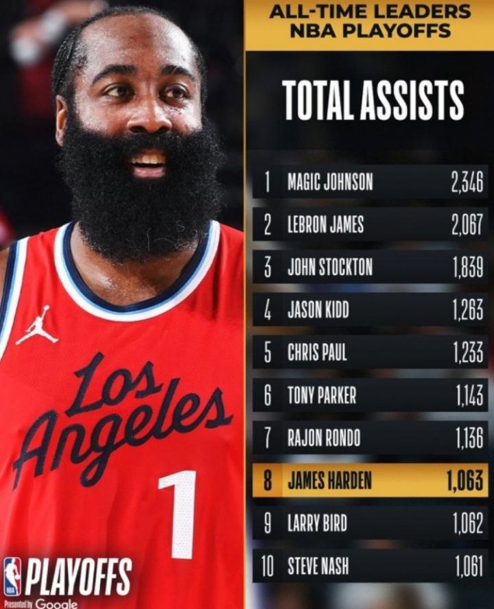 此外,哈登首节还送出2次助攻,季后赛生涯总助攻数来到1063次,超越拉里-伯德和纳什升至历史第8位,排在他身前的是季后赛生涯送出1136次助攻的隆多。