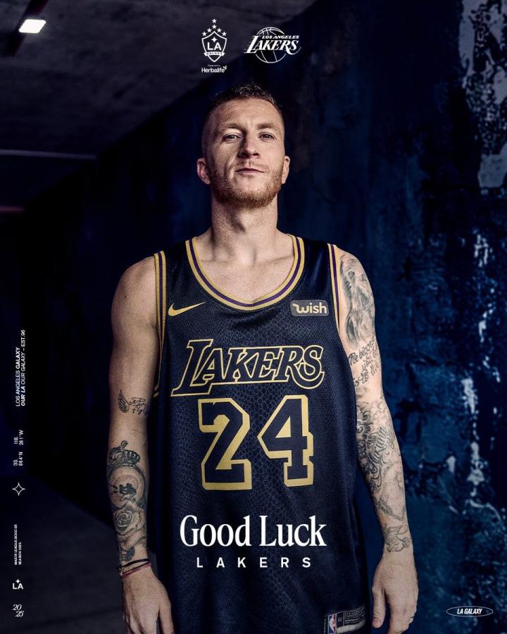 洛杉矶银河晒罗伊斯穿科比球衣照,助威湖人季后赛