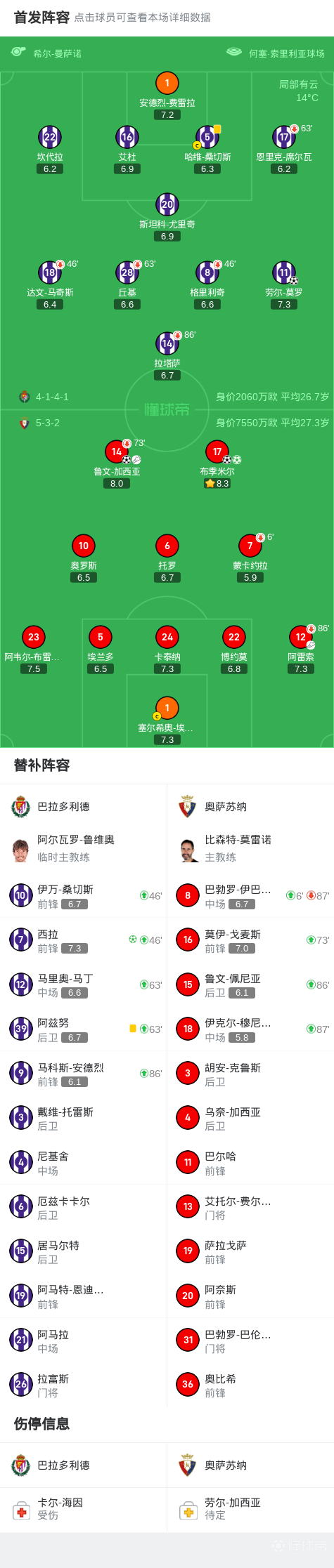 奥萨苏纳客场3-2巴拉多利德,布季米尔双响,鲁文-加西亚传射