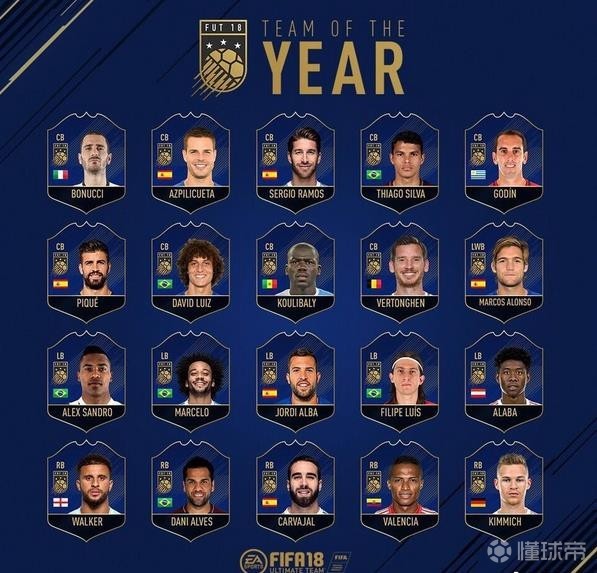 后卫:博努奇,阿斯皮利奎塔,拉莫斯,蒂亚戈.席尔瓦,戈丁,皮克,大卫.路易斯,库里巴利,维尔通亨,马克斯.阿隆索,桑德罗,马塞洛,阿尔巴,费利佩.路易斯,阿拉巴,凯尔.沃克,阿尔维斯,卡瓦哈尔,瓦伦西亚,基米希