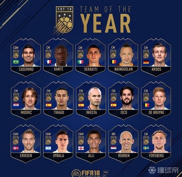 中场:卡塞米罗,坎特,维拉蒂,纳英格兰,克罗斯,莫德里奇,蒂亚戈,伊涅斯塔,伊斯科,德布劳内,埃里克森,迪巴拉,阿里,罗本,福斯贝里