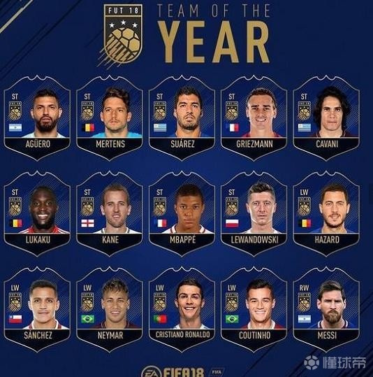 前锋:阿奎罗,默滕斯,苏亚雷斯,格列兹曼,卡瓦尼,卢卡库,凯恩,姆巴佩,莱万多夫斯基,阿扎尔,桑切斯,内马尔,C.罗纳尔多,库蒂尼奥,梅西