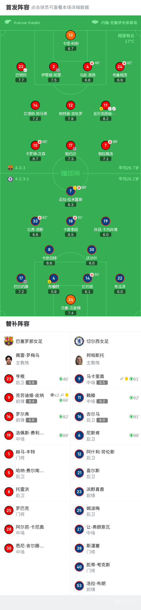 巴萨女足4-1切尔西女足,皮纳2射1传,普特利亚斯失点+2助