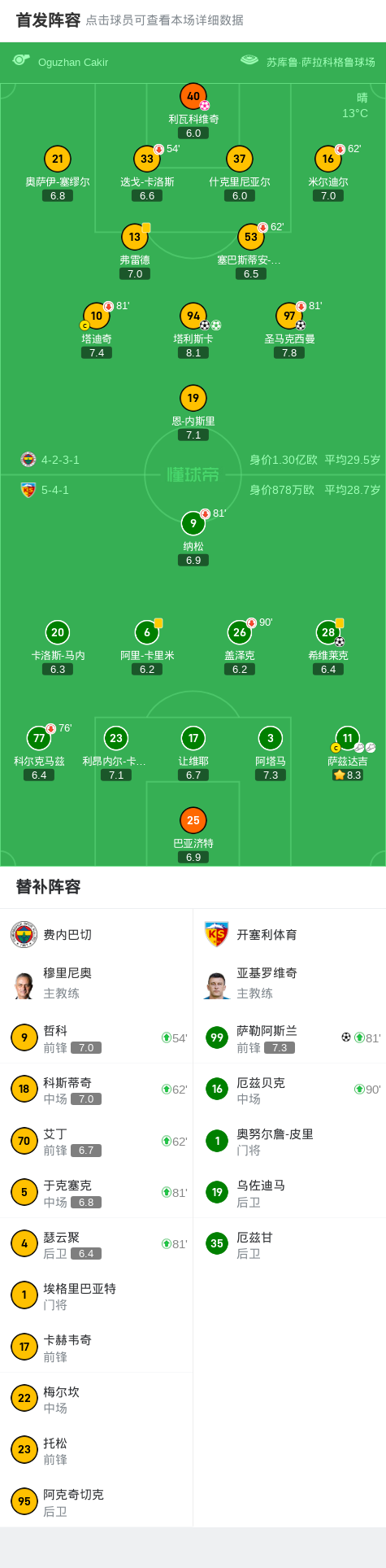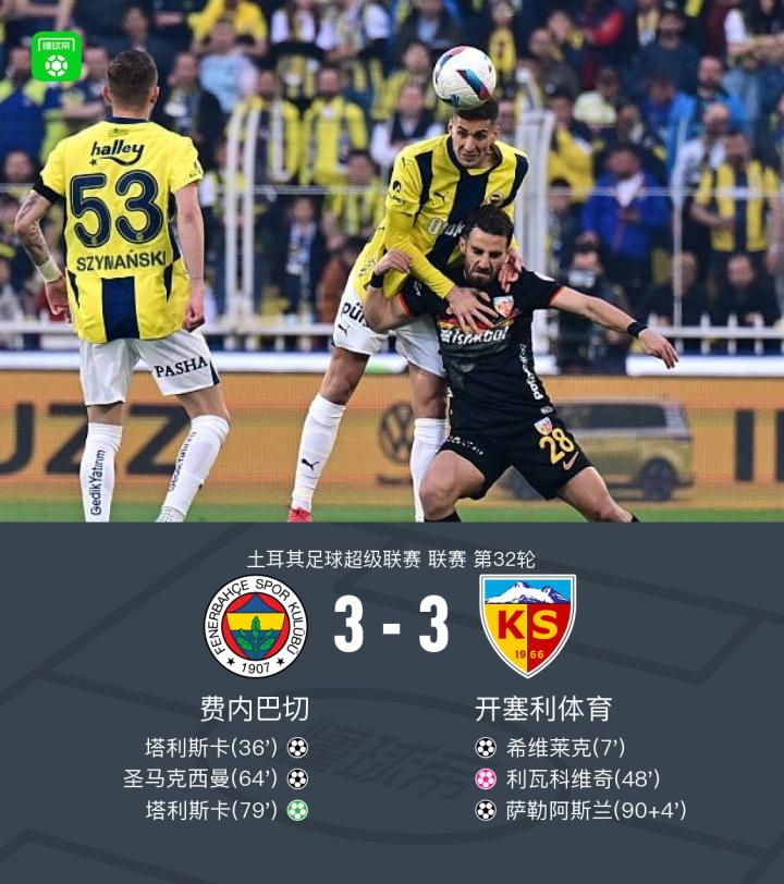 费内巴切3-3开塞利体育,塔利斯卡双响、萨勒阿斯兰绝平