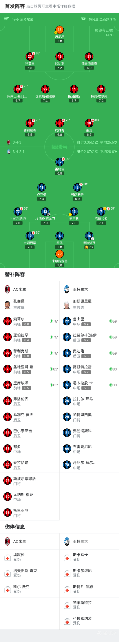第80分钟,亚特兰大换人,米兰旧将德凯特拉雷替补登场