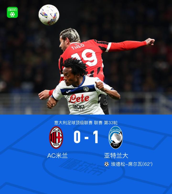 北京时间4月21日,意大利足球顶级联赛第33轮,AC米兰主场迎战亚特兰大。上半场,两队均无建树。下半场,贝拉诺瓦头球摆渡,埃德松-席尔瓦冲顶打破僵局,红黑军团全场只有1脚射正。全场比赛结束,米兰0-1不敌亚特兰大,本赛季联赛被对手双杀。