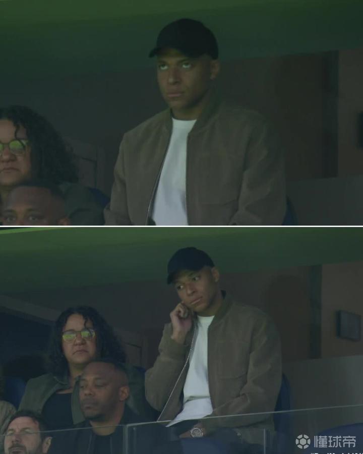 本场比赛,姆巴佩坐在看台上观看比赛,身穿棕色夹克,头戴深色帽子的姆巴佩抬头瞥了一眼大屏幕,他似乎也意识到嘘声是冲着他来的。