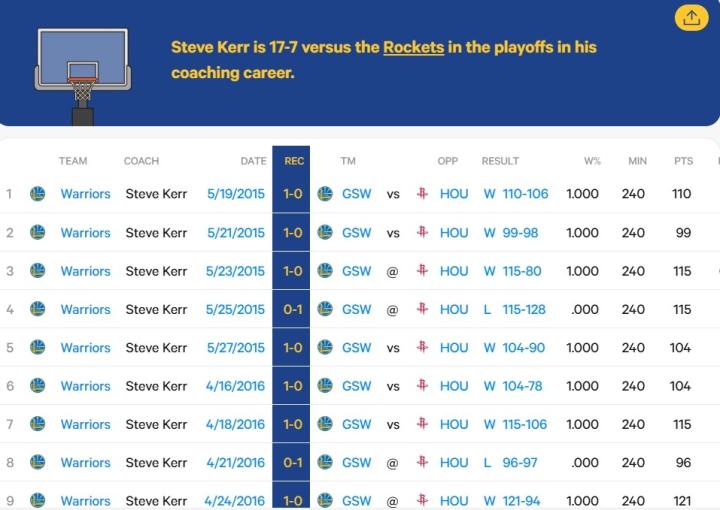 此役过后,科尔执教生涯面对火箭的战绩变为17胜7负,胜率高达70.7%,此前4次季后赛与火箭相遇系列赛全部取胜。