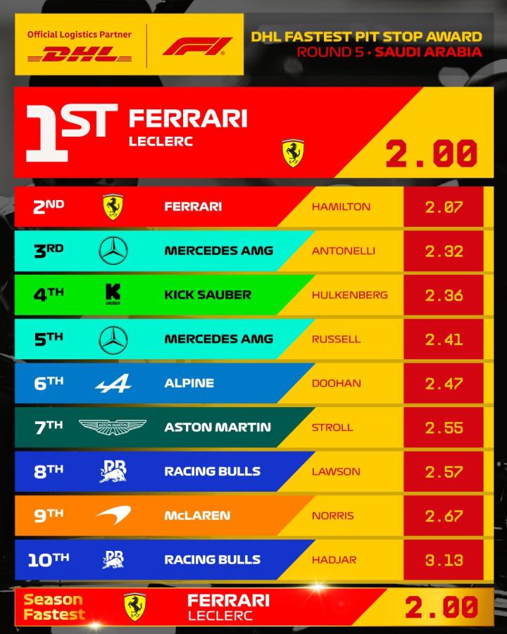 你是谁?法拉利连续五站完成最快进站&创造本赛季最快进站纪录ld990513 @懂球帝2025-04-21 13:59根据官方发布的数据,在F1沙特大奖赛中,法拉利为两位车手的换胎时间分别为2.00秒和2.07秒,占据榜单头排。至此,法拉利本赛季包揽了每一站的最快换胎,且为勒克莱尔的2.00秒换胎是本赛季最快。官方配文:“法拉利车队本赛季在换胎时间比赛中继续保持不败。而且这一次,查尔斯-勒克莱尔和刘易斯-汉密尔顿分列一二名。”展开更多