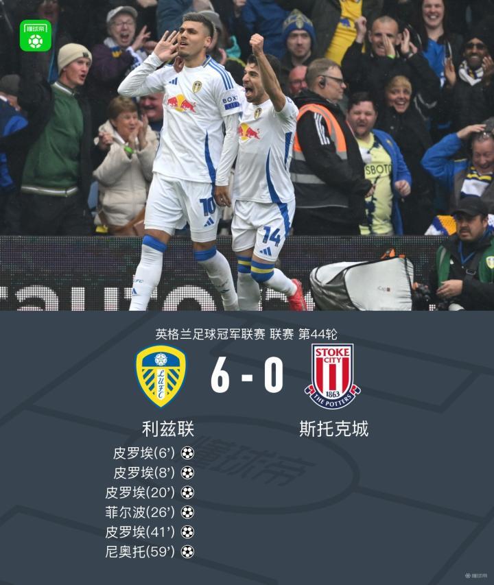 利兹联6-0斯托克城升超在望,皮罗埃大四喜,尼奥托建功