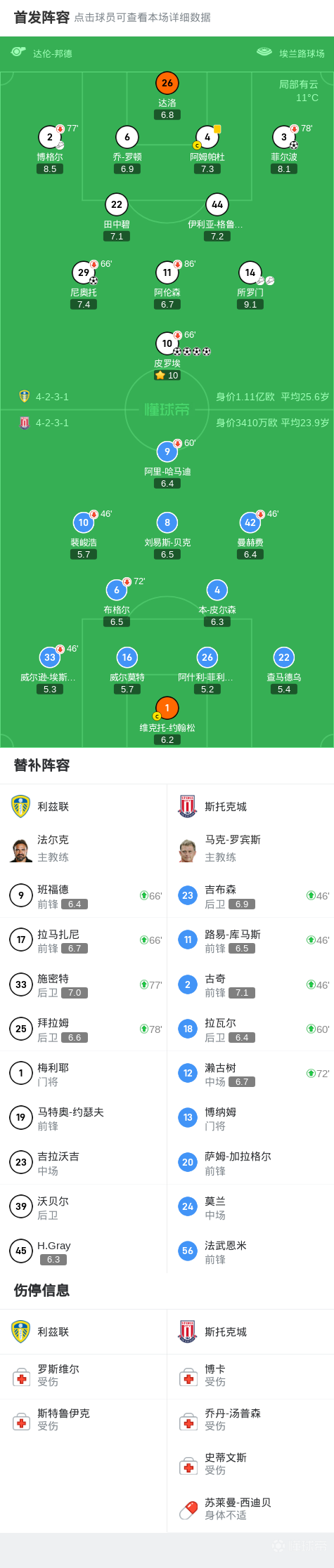第6分钟,斯托克城后防失误,皮罗埃破门,利兹联1-0领先