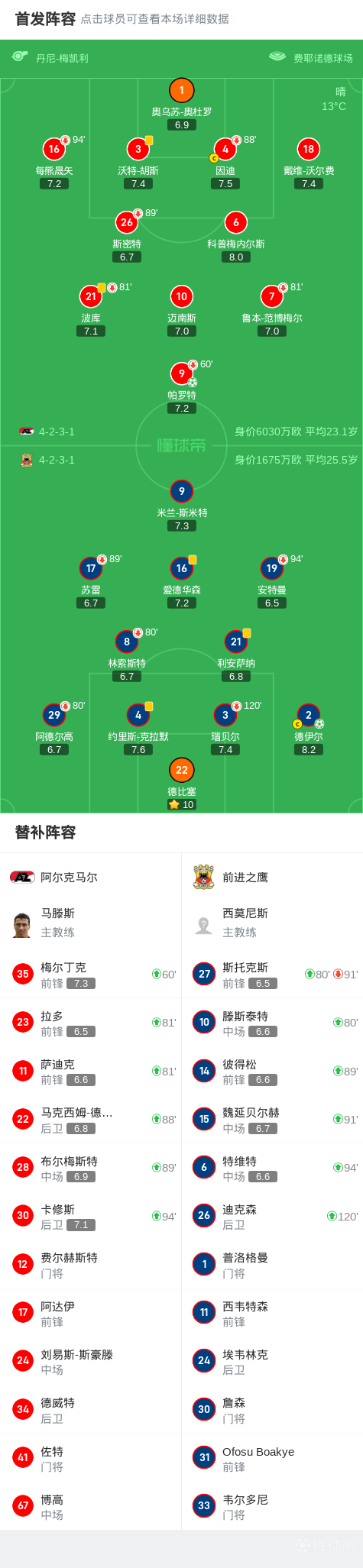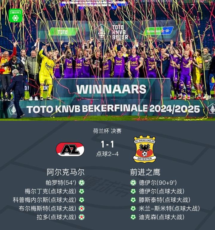 前进之鹰点杀阿尔克马尔夺得荷兰杯冠军,德伊尔补时绝平战报bot2025-04-22 03:05北京时间4月22日荷兰杯 决赛,阿尔克马尔对阵前进之鹰。阿尔克马尔帕罗特破门。前进之鹰德伊尔补时点球绝平,双方进入加时赛。加时赛双方仍未进球,进入点球大战。点球大战前进之鹰4-2战胜阿尔克马尔。最终前进之鹰5-3战胜阿尔克马尔,夺得荷兰杯冠军。点击查看本场比赛详细数据>>点击查看荷兰杯完整积分榜>>精彩瞬间第54分钟,阿尔克马尔球员帕罗特罚入点球。下半场补时第9分钟,前进之鹰球员德伊尔罚入点球。战报详情更新中……球队阵容技术统计展开更多