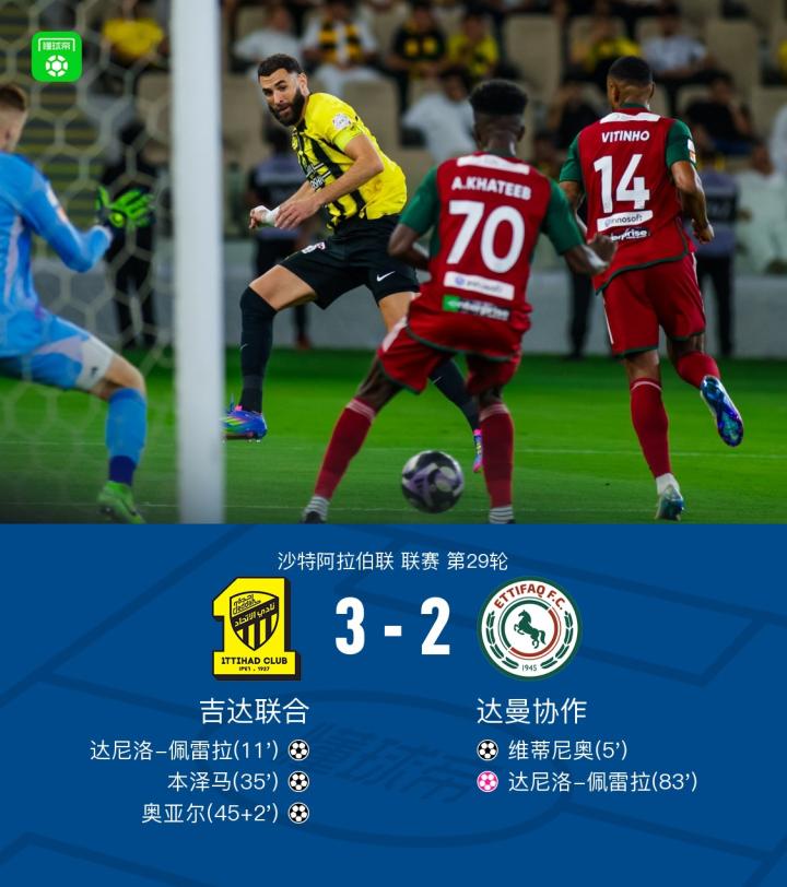 吉达联合3-2达曼协作,本泽马传射,达尼洛-佩雷拉建功+乌龙