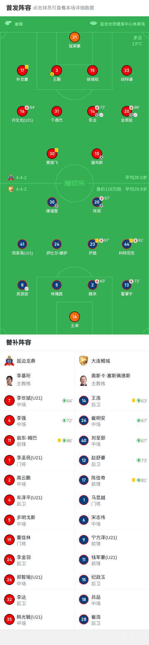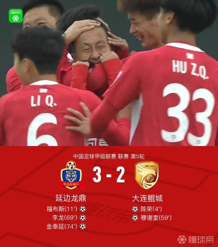 北京时间4月22日,中国足球甲级联赛第5轮,延边龙鼎主场迎战大连鲲城。比赛中,大连鲲城由陈荣率先打破僵局,随后延边龙鼎的福布斯迅速扳平比分。大连鲲城的穆谢奎再度将比分超出,但延边龙鼎并未放弃,李龙和金泰延连续建功,帮助球队完成逆转。最终,延边龙鼎以3-2战胜大连鲲城。