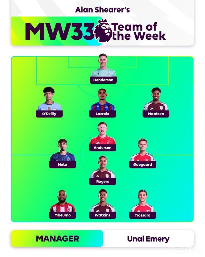 英超官方发布了阿兰-希勒评选的英超第33轮最佳阵容,特罗萨德、内托、奥赖利等人在列。