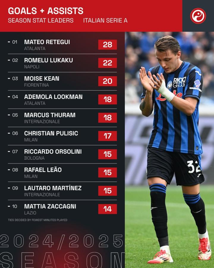 据统计,雷特吉、卢卡库和莫伊塞-基恩是本赛季意甲联赛截至目前直接参与进球数量最多的三名球员。