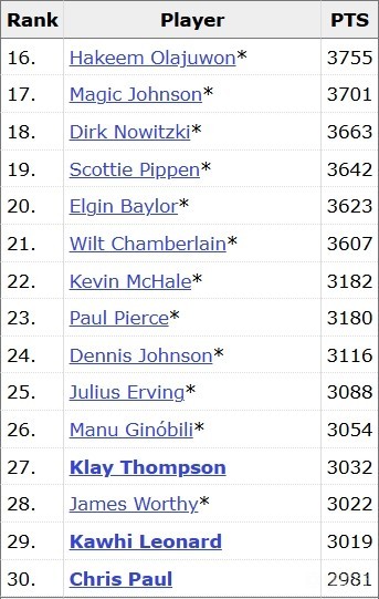 目前排在莱昂纳德身前的是詹姆斯-沃西和克莱-汤普森,二人只比莱昂纳德多了3分和13分,莱昂纳德下场比赛便有望完成超越。