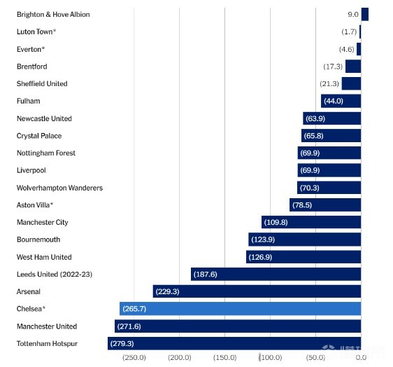 切尔西的财务操作在欧足联规则下受到了重大影响。2023年夏季转会窗,切尔西斥资4.543亿英镑引援。根据英超规则,这笔费用可按球员合同的完整年限摊销(例如莫伊塞斯-凯塞多签了8年合同),但欧足联规则仅允许5年摊销。以凯塞多为例,他从布莱顿以1亿英镑基础转会费加盟,其转会费在接下来的5个赛季中,每个赛季将额外增加750万英镑计入切尔西的欧足联PSR计算。