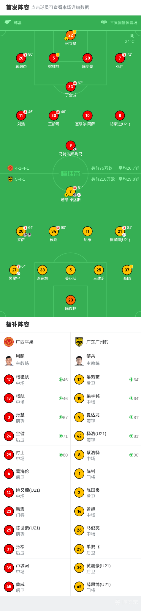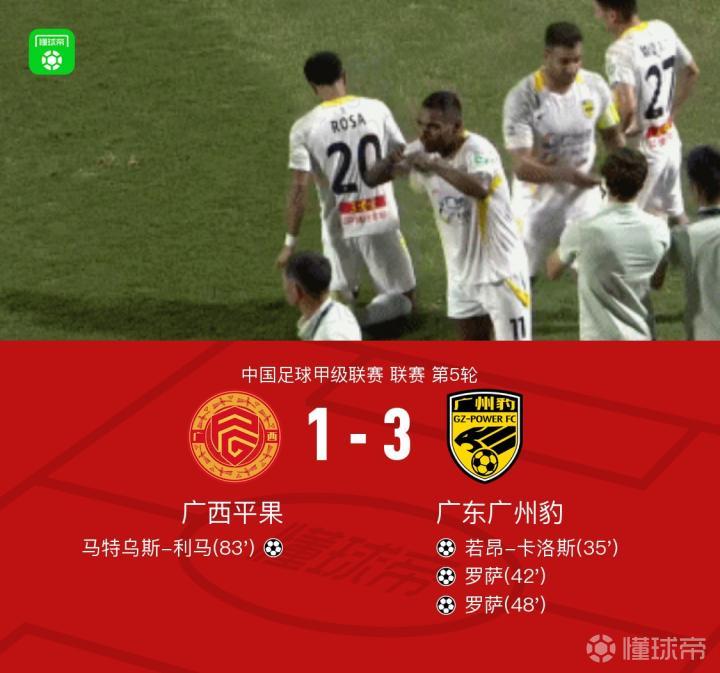 北京时间4月23日,中国足球甲级联赛第5轮,广西平果主场迎战广东广州豹。上半场,若昂-卡洛斯先拔头筹后又助攻罗萨破门;下半场,罗萨完成梅开二度,马特乌斯-利马扳回一城。最终,广西平果主场1-3不敌广东广州豹。