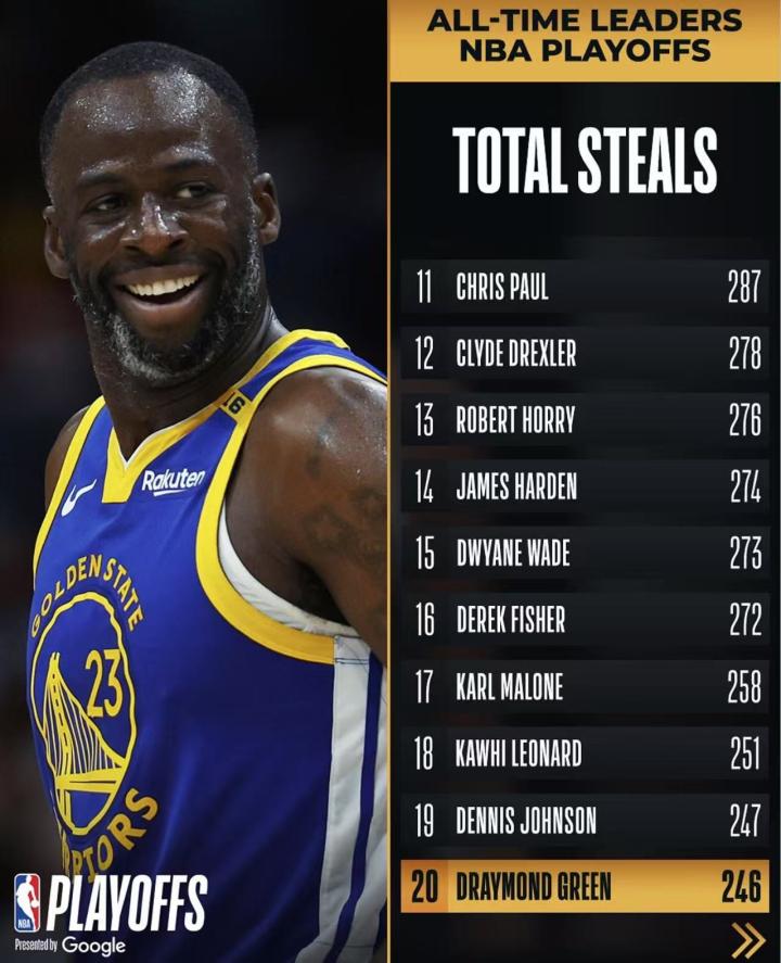 比赛正在进行中,德雷蒙德-格林本场比赛已经贡献3次抢断,至此,他的生涯季后赛抢断数达到246个,超越火箭名宿奥拉朱旺的245个,排名历史第20位。在他前面的是丹尼斯-约翰逊和莱昂纳德。