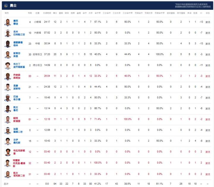 金州勇士斯蒂芬-库里20分5板9助1断1帽,穆迪12分2板1助1断1帽,昆顿-波斯特12分2板1助1断。