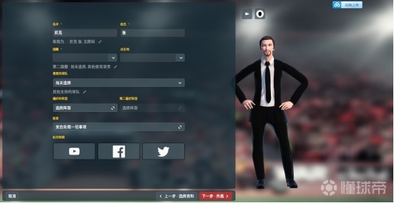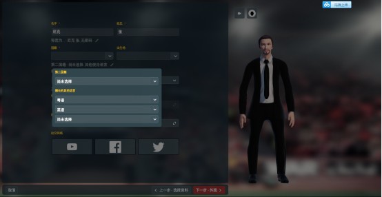 第一步是设定个人资料。其中比较重要的内容是使用语言的设定。举个例子,如果你想要在游戏里执教英格兰联赛的球队,最好在使用语言设定的这一栏加上英语。
