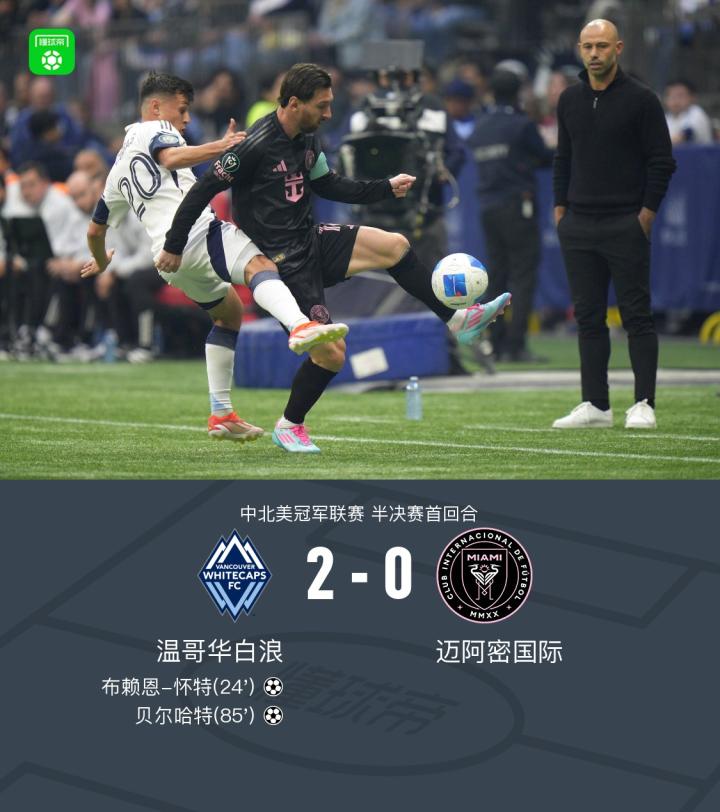 北京时间4月25日中北美冠军联赛半决赛首回合,迈阿密国际客场对阵温哥华白浪。温哥华白浪凭借着布赖恩-怀特与贝尔哈特的进球,最终在主场2-0战胜迈阿密国际,双方次回合的比赛将于北京时间5月1日上午8:00举行。