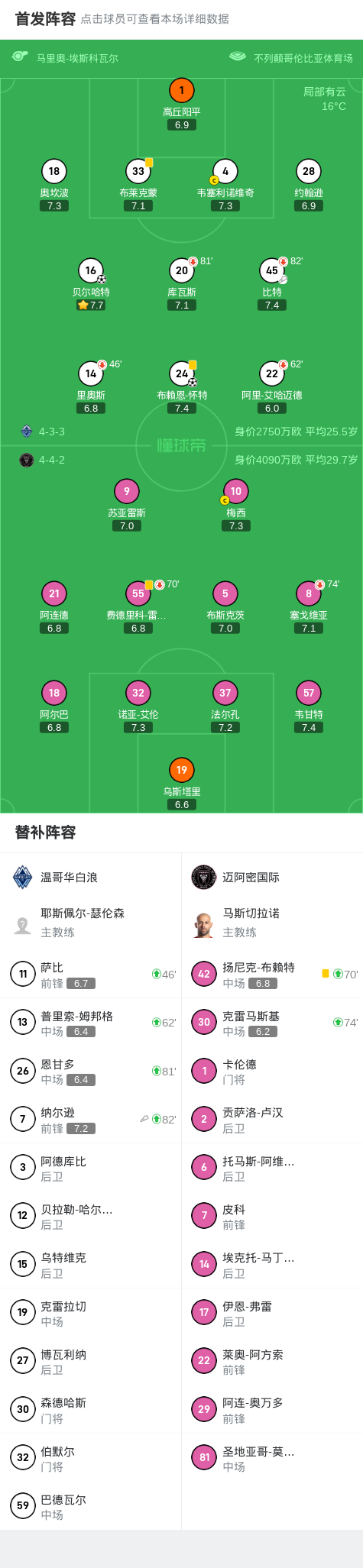 美冠杯半决赛首回合:迈阿密国际客场0-2温哥华白浪,怀特破门