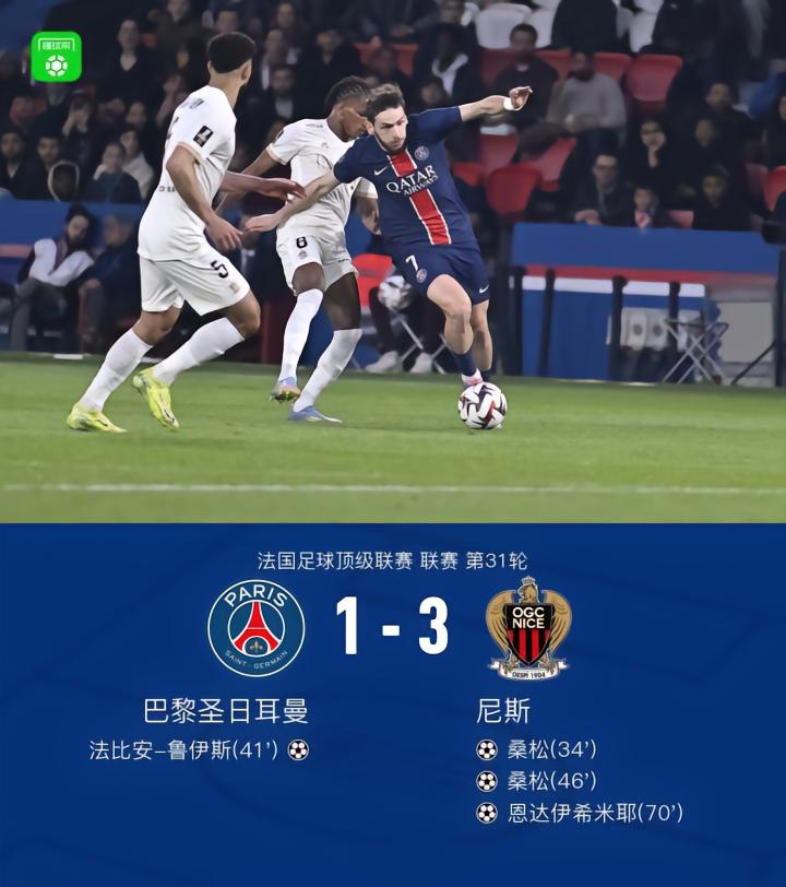 北京时间4月26日法国足球顶级联赛 联赛 第31轮,巴黎圣日耳曼主场对阵尼斯。上半场登贝莱禁区抽射被门将扑出,法比安-鲁伊斯抢点头球攻门被门将扑出,布阿纳尼送出助攻,桑松推射破门先拔头筹,随后登贝莱助攻法比安-鲁伊斯破门扳平比分。下半场刚开始若纳唐-克洛斯助攻桑松破门完成梅开二度,恩达伊希米耶一次抢点头球破门将比赛终结。全场战罢,最终比分巴黎圣日耳曼 1-3 尼斯。