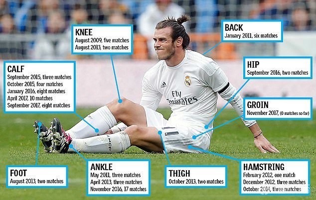 (9年18次伤病,贝尔的出勤率持续走低。)