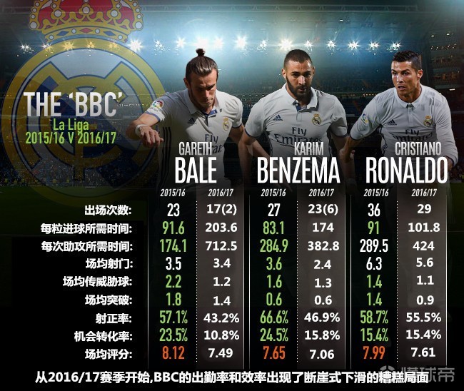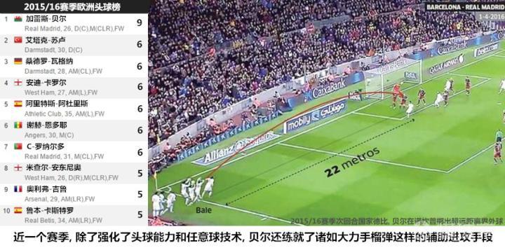 很多人将伊斯科的上位看作是皇马风格转型的起点,然而,皇马在上赛季末段并没有太多通过中路连续传切配合取得进球的案例,他们得分率最高的进攻手段依然是边路传中和中长距离传球引领的高球冲击。即依靠后置核心(克罗斯&卡塞米罗)发动长传,通过边后卫的冲击和前锋球员的快速跟进捕捉对手防线身后的空当,如果贝尔没有伤病,他完全可以像本泽马和C罗一样适应双前锋体系。