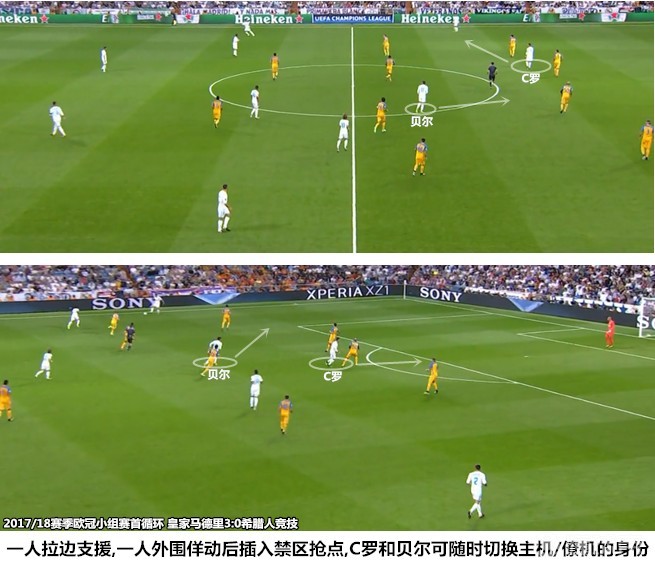 (如果对手选择囤兵禁区,C罗和贝尔轮流冲击禁区,两人不应该存在明显的主副关系,两人的策应、传中和后插上抢点能力都很出色。)