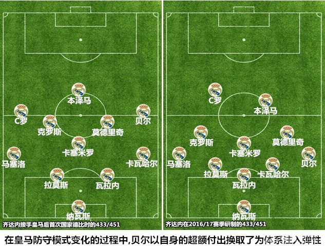 2016/17赛季曾一度被认为是皇马内部进行权力交接的时刻,C罗因为膝部伤势直到赛季开打两个月之后才复出,贝尔在赛季初携欧洲杯之余威迅速成为皇马实际意义上的战术核心。随着赛季的深入,齐达内在战术层面的试验愈发大胆,皇马的典礼433阵型在无球状态下已经不会像安切洛蒂时代一样呈4-5-1站位,而是深度回收为一个重心靠后的5-3-2模型。贝尔和C罗不用像过去那样同时戍边,而是一人沉入右闸拓展防线宽度,一人留在高位等待反击机会。