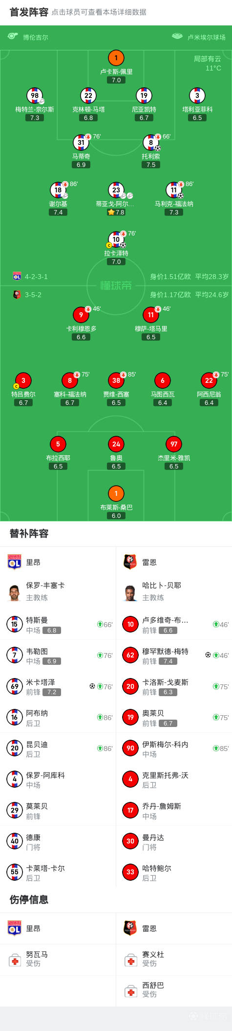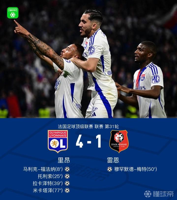 里昂4-1雷恩,福法纳、托利索破门,拉卡泽特、米卡塔泽建功