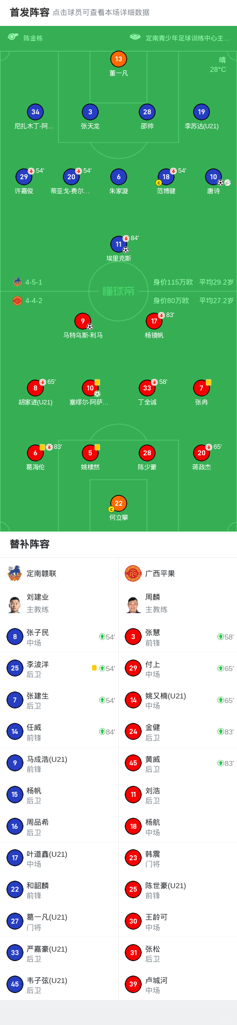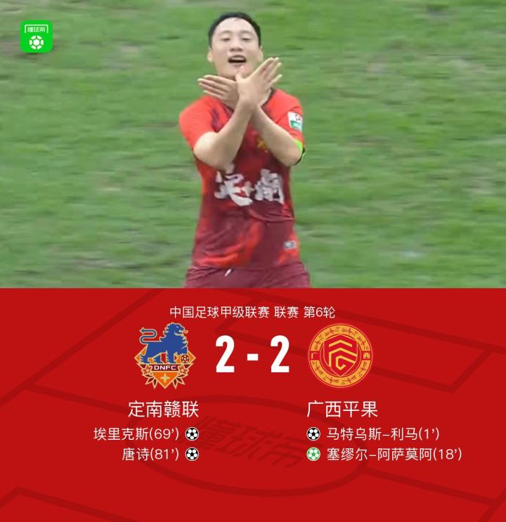 北京时间4月27日中国足球甲级联赛 联赛 第6轮,定南赣联主场对阵广西平果。上半场马特乌斯开场19秒破门,之后张冉造点,阿萨莫阿主罚命中。下半场唐诗送助攻,埃里克斯破门扳回一球,之后唐诗任意球直挂死角。最终比分定南赣联 2-2 广西平果。