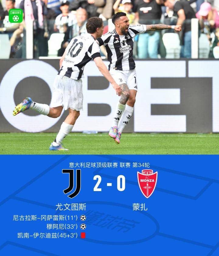 北京时间4月28日0:00,意甲第34轮继续进行,尤文图斯坐镇主场都灵安联球场迎战蒙扎,本场主裁判为佩伦佐尼。上半场,尼古拉斯-冈萨雷斯轰世界波,凯夫伦-图拉姆助攻穆阿尼破门,伊尔迪兹肘击被直红罚下。下半场,尼古拉斯-冈萨雷斯打门被扑。最终,十人尤文主场2-0击败蒙扎。
