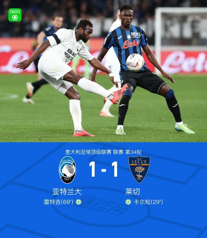 意大利足球顶级联赛第34轮,亚特兰大主场迎战莱切。比赛中,莱切由卡尔松通过点球机会取得领先。随后,亚特兰大的雷特吉同样凭借点球扳平比分。最终,双方以1-1的比分握手言和。