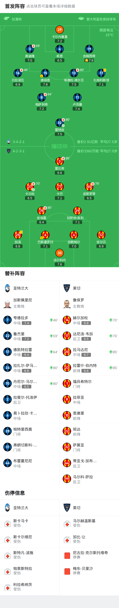 亚特兰大1-1莱切,卡尔松、雷特吉各自点射建功