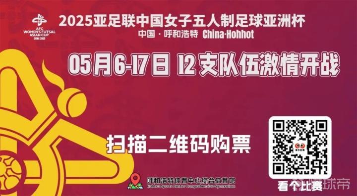 2025年亚足联中国女子五人制足球亚洲杯将于5月6日至17日在呼和浩特举行,12支亚洲顶级女子五人制足球队将在呼和浩特体育中心综合馆角逐冠军荣耀。女五亚洲杯门票于4月17日上午10-17在唯一官方售票平台“看个比赛”正式开售。