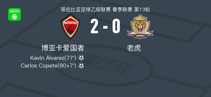 北京时间4月29日,哥伦比亚足球乙级联赛春季联赛第13轮,博亚卡爱国者主场迎战老虎。比赛中,博亚卡爱国者凭借Kevin Álvarez的进球取得领先,随后Carlos Copete再入一球锁定胜局。最终,博亚卡爱国者以2-0战胜老虎。