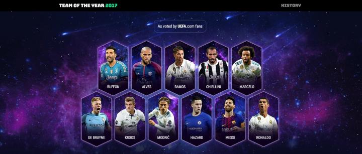 北京时间1月11日,欧足联官方公布了由球迷票选的2017年年度最佳阵容。其中,上赛季获得欧冠和西甲冠军的皇马共有五名球员上榜。球员方面,皇马、巴萨两大王牌C罗和梅西领衔攻击线,但本赛季世界第一转会费加盟巴黎的内马尔并未入选,本赛季状态出色的热刺前锋哈里-凯恩也未能上榜。