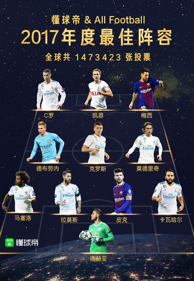 此前在1月2日,懂球帝也正式公布了由广大球迷票选的2017年年度最佳阵容(相关链接:【懂球帝&All Football 2017年度最佳阵容:皇家马德里六人入选】)。
